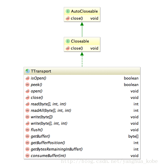 Thrift默认提供了很多客户端通信技术的实现,而这些实现类都必须实现TTransport这一基接口,该接口的类图如下: