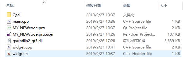先将解压目录下的Qt4Qt5中的Qsci目录拷贝到新创建的工程目录下。将qscintilla2.lib也放到项目文件下。