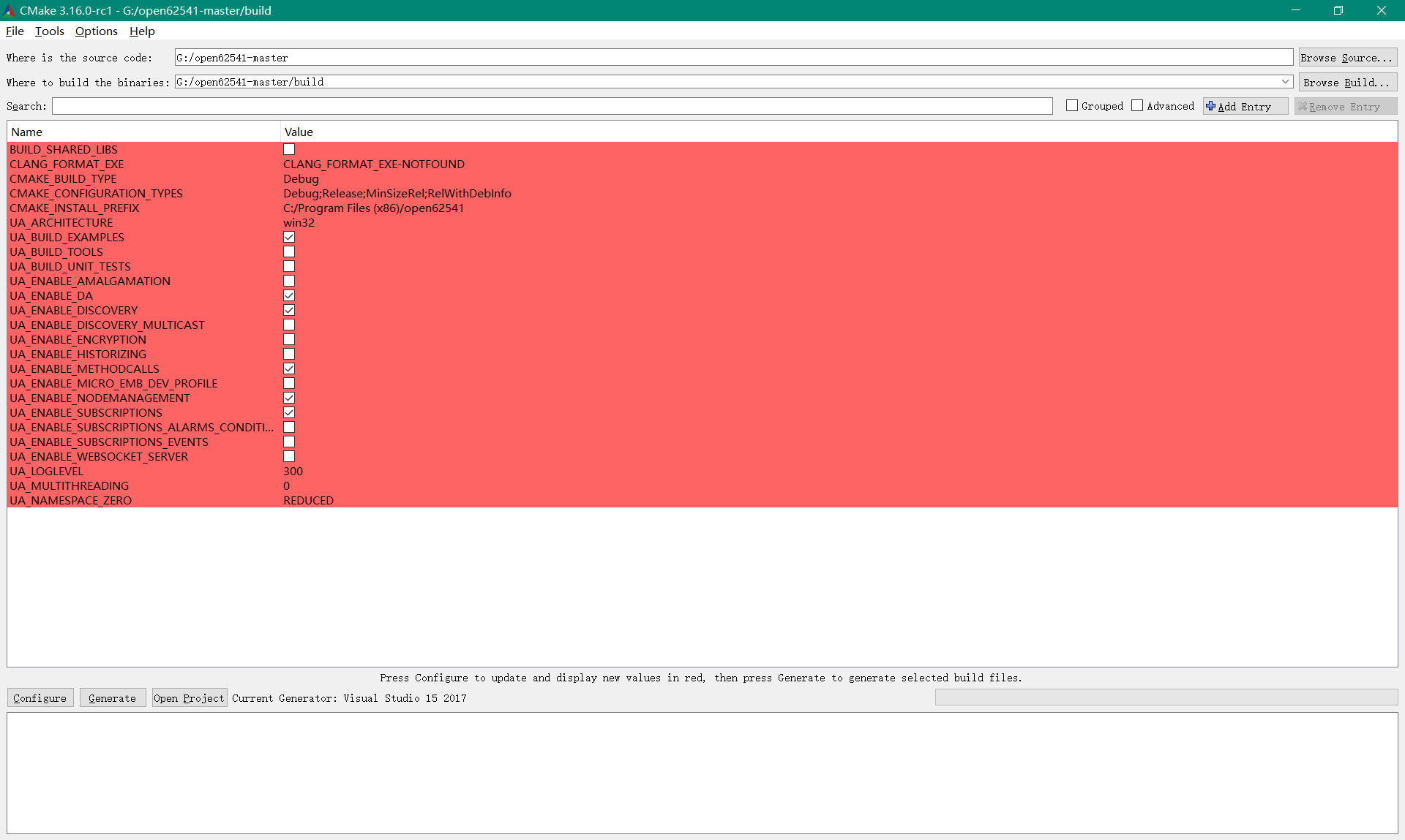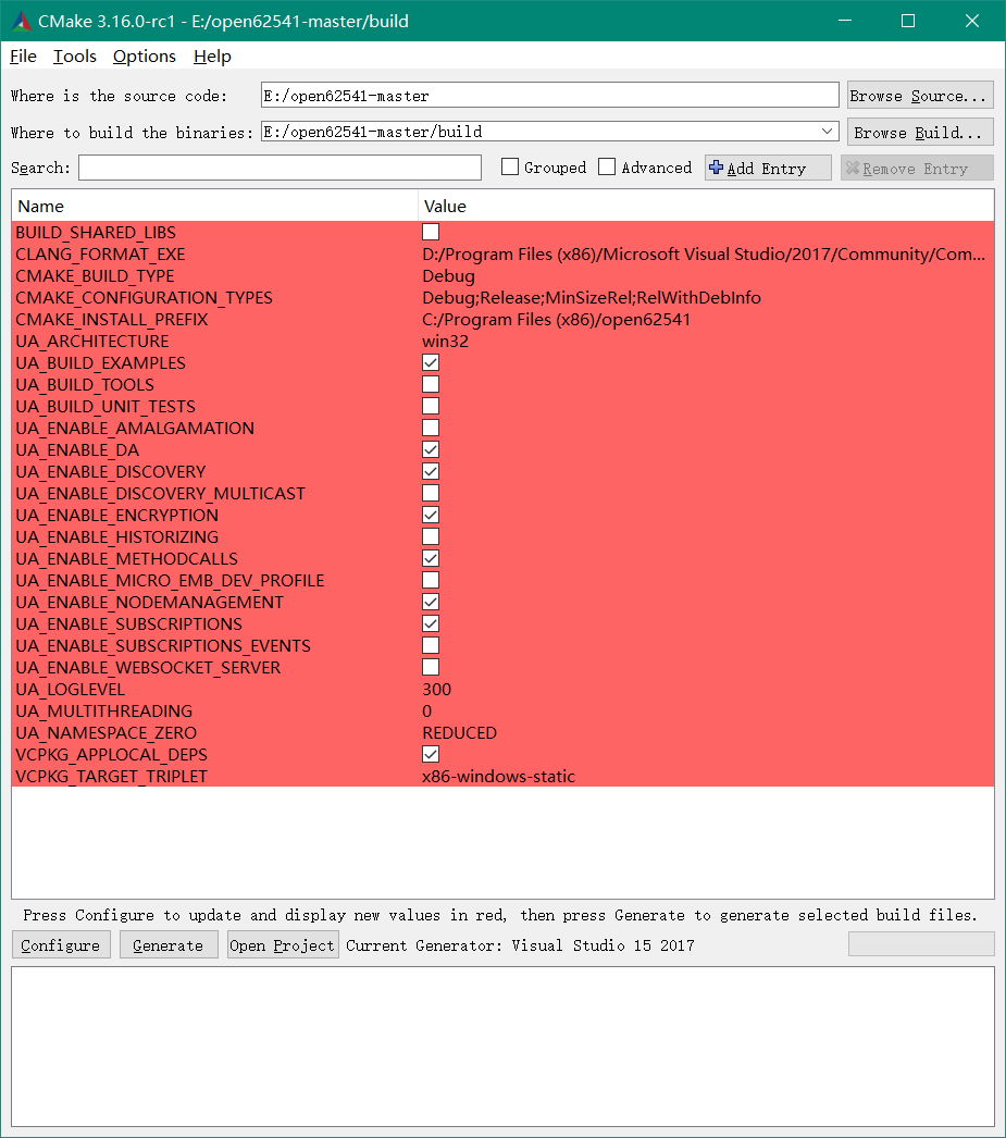 E:\open62541-master\build>cmake .. -G "Visual Studio 15 2017" -DUA_ENABLE_ENCRYPTION=ON -DUA_BUILD_EXAMPLES=ON -DCMAKE_TOOLCHAIN_FILE="D:\Program\vcpkg\scripts\buildsystems\vcpkg.cmake" -DVCPKG_TARGET_TRIPLET="x86-windows-static"