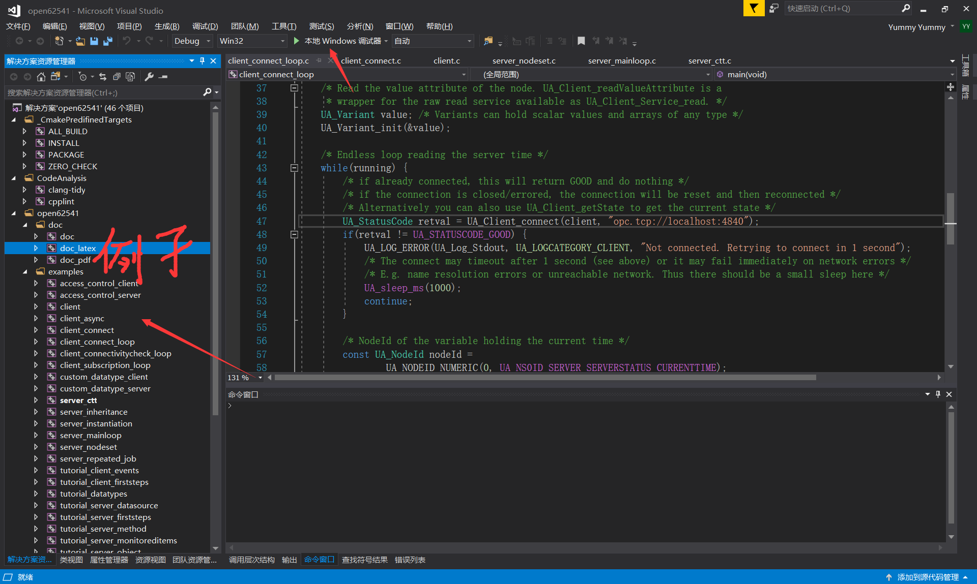 这时,你可以将example里面的程序设置为启动项 ,进行调试,测试,可以在open62541-master\build\bin\examples中找到可执行文件,进行配合使用。