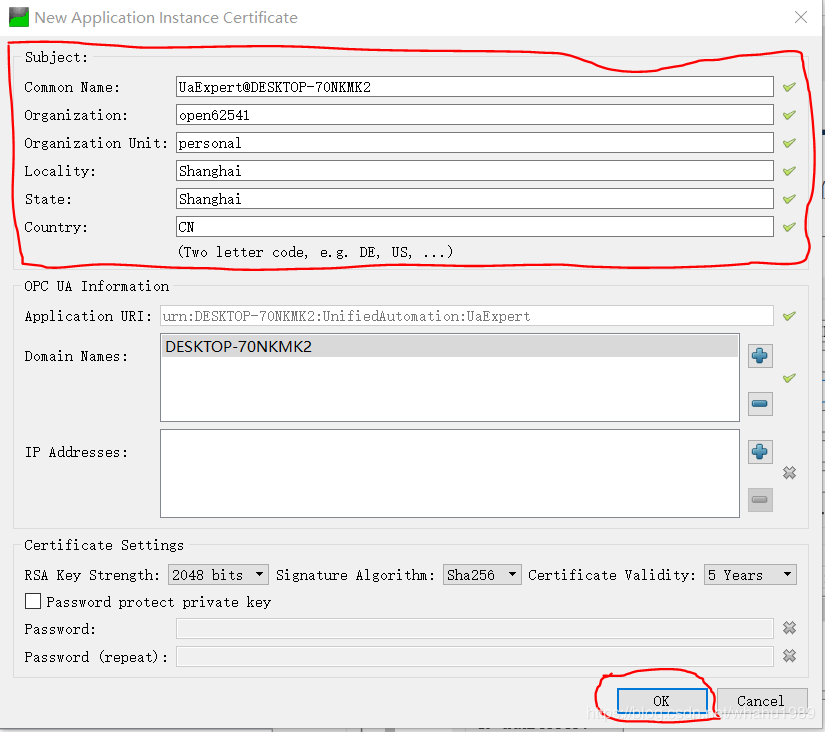 第一次打开UaExpert会弹出如下界面,主要填写Subject那一栏,如上图,这些信息可以随便填(有过制作安全证书(Certificate)的同学应该知道这些信息是用来制作csr的)。然后点击OK。