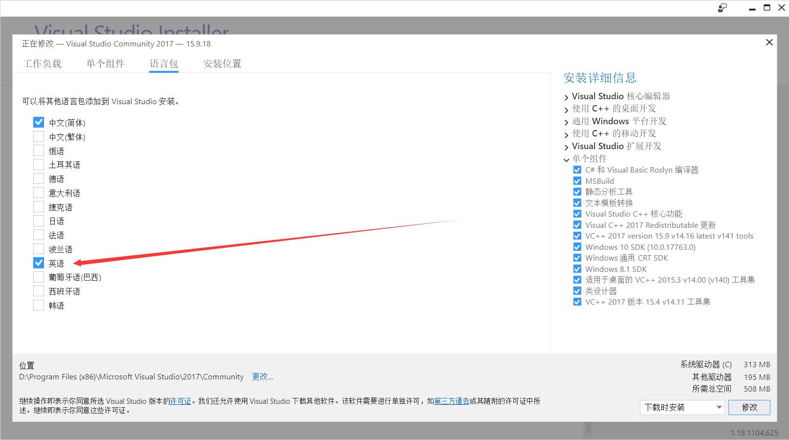 vcpkg 按他说的,少英文语言包,到VS2017安装向导,修改安装,点语言包,勾选英语;再去安装第三方库,发现OK了....;