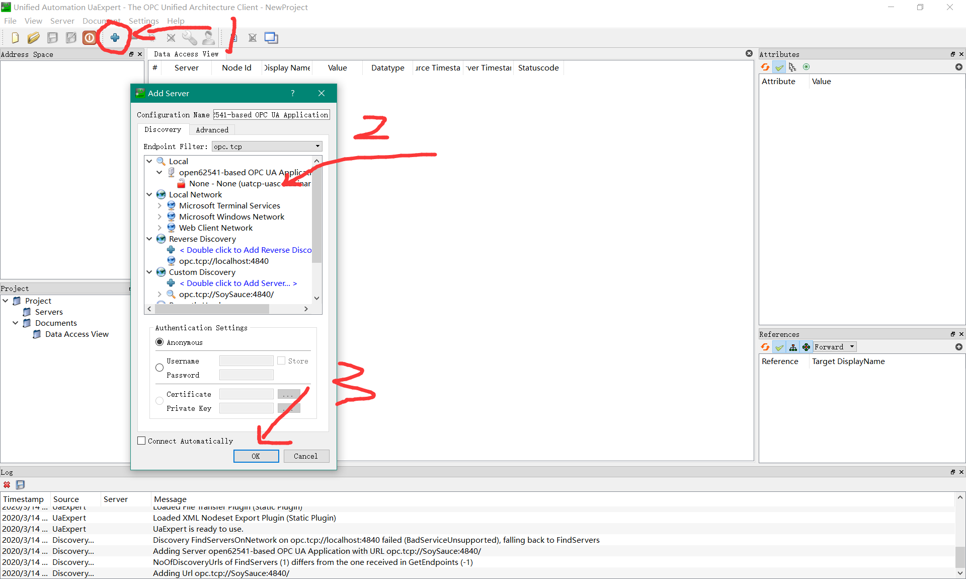 如上图所示,点击"十"添加服务器,因为我们使用的端口是4840所以可以通过Local进行发现它,默认是Anonymous匿名模式,点击ok确定当前服务器。