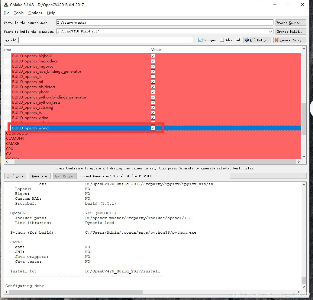 其中会下载一些第三方文件,可以自行下载,否则速度较慢。第一次configure完成之后,勾选BUILD_opencv_world.