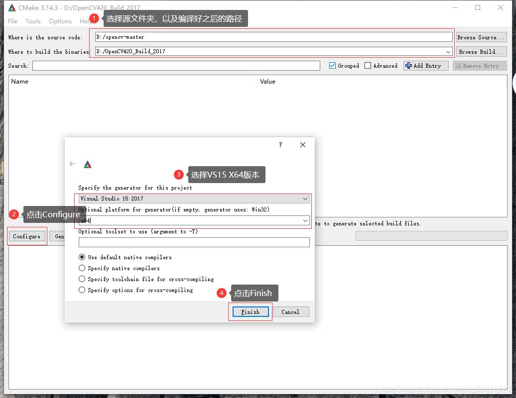 打开CMake,选择源码路径,以及生成路径,选择对应VS版本。开始第一次Configue。