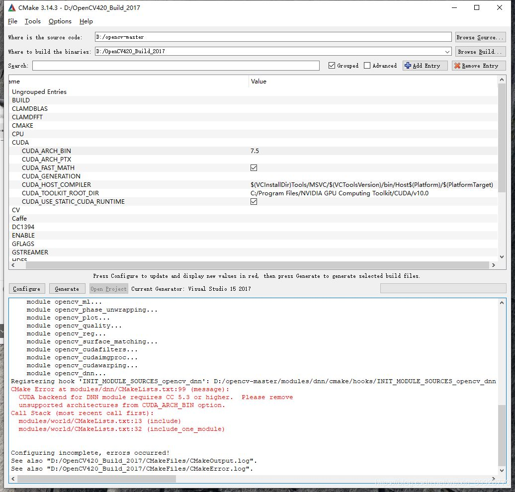 进行第二次Configure,Configure完成之后可能会报错,此时不管他,根据GPU算力表选择合适的CUDA_ARCH_BIN值,如我的是RTX2080Ti,则将CUDA_ARCH_BIN其余值删除,只留下7.5。然后勾选CUDA_FAST_MATH,点击Configure。