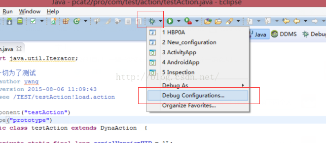 1.打开Eclipse或者MyEclipse,在主界面上侧的工具栏中选择debug模式的Debuge Co'nfigurations配置项,如下图所示: