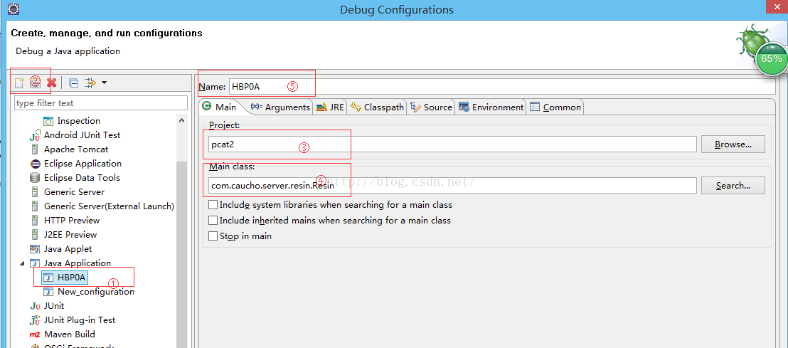 2.在弹出的界面中选中左侧面板中的java application项,在上面标注②的地方选择新建一个java application,在右侧进行配置,如标注⑤该名称可以任意命名对配置没有影响,标注③是选择启动的工程,点击右侧的Browse选择要配置启动的工程即可,标注④是Main Class配置,该class是固定项,resin3.x版本的都使用此配置,但是resin2.x我记得好像不是此配置,需要配置2.x的朋友可以去查查