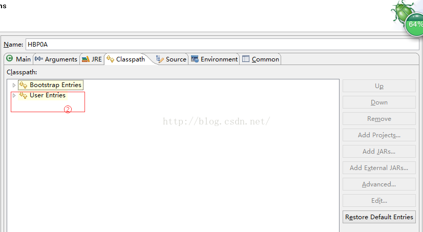 标注②是先将自己的project(项目)添加进来,然后再将自己项目下的所以jar文件添加进来(即先 add projects再add jars),到现在为止配置完毕,点击配置项下侧的Debug按钮即可运行