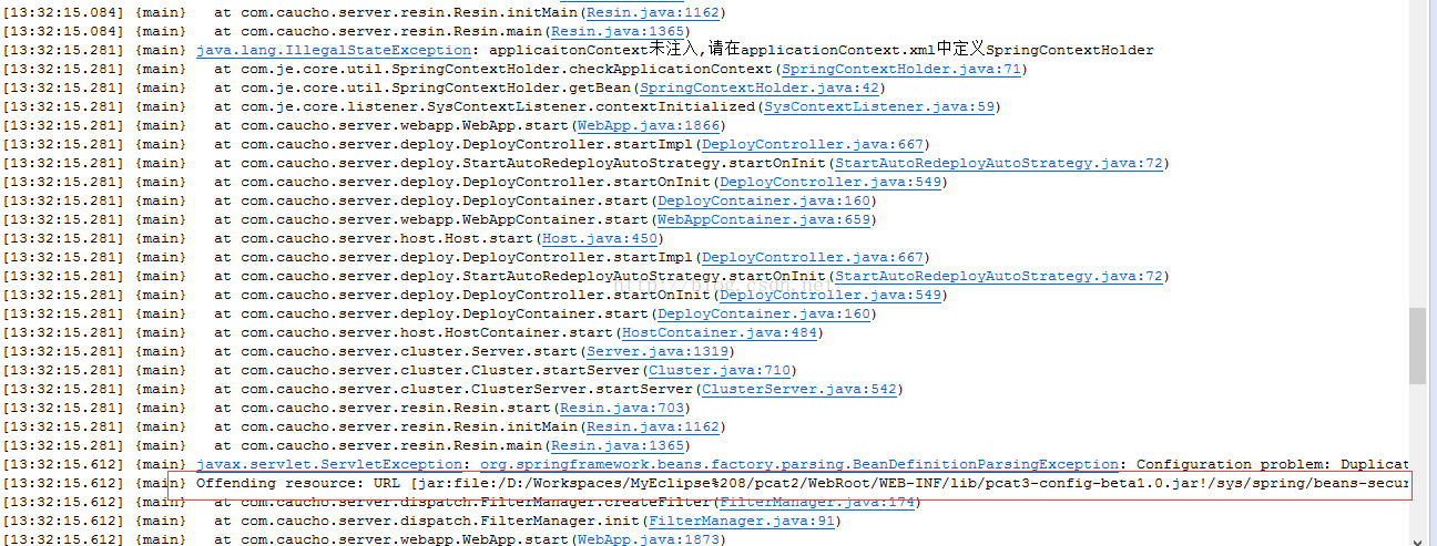 Offending resource: URL [jar:file:/D:/Workspaces/MyEclipse%208/pcat2/WebRoot/WEB-INF/lib/pcat3-config-beta1.0.jar!/sys/spring/beans-security.xml]