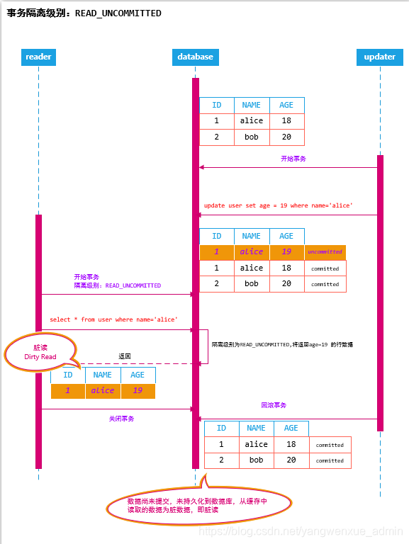 如上图所示:客户端reader在事务的过程中,读取到了其他客户端updater尚未提交的数据,之后客户端reader 可能将其当做已经持久化的数据进行业务操作,而实际上,客户端updater可能将其数据回退;在此过程中,客户端reader读取的数据就成了脏数据,客户端reader的读数据行为为:脏读(Dirty Read)
