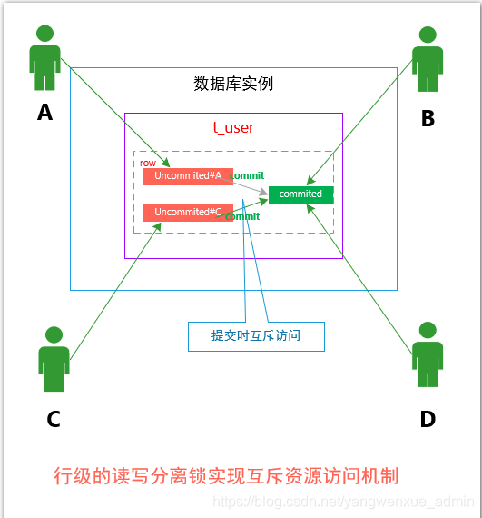 上述的读已提交(READ_COMMITTED)的本质,是将资源互斥访问的粒度控制到 committed的行数据上,而实际上,还可以继续将资源互斥的访问粒度,细化到未提交(UNCOMMITED)的行数据上,如下图所示: