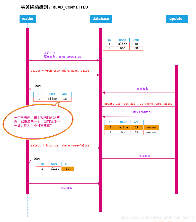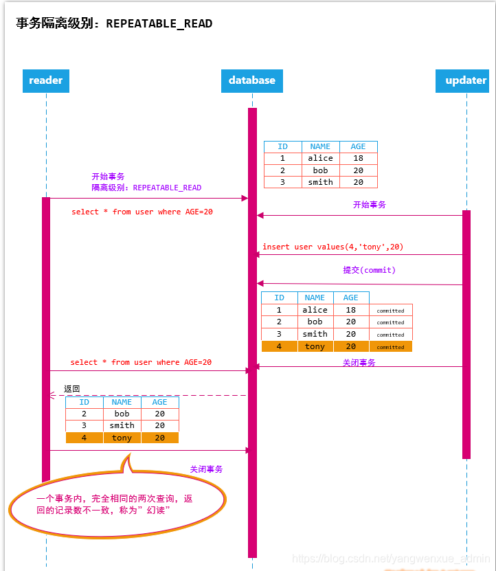 上述的例子中,reader在一个事务中,相同的查询条件,返回的行记录是同一条,但是这一条的记录的AGE列值从18变成19,虽然是相同的行记录,但是内容不一致,这种现象叫做不可重复读(NO-REPEATABLE-READ)。