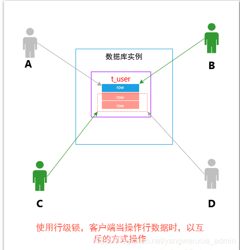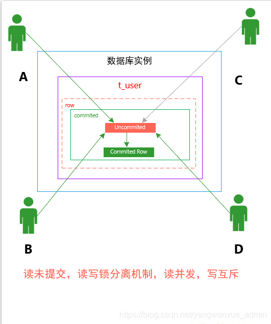 客户端A和客户端B 同时尝试访问相同的行数据;而客户端C和客户端D也是同时尝试访问相同的行数据。在此竞争过程中,可以看到,最多可以有两个客户端可以同时访问表T_USER,和序列化读相比,整个客户端的并发量又提高了一个量级!