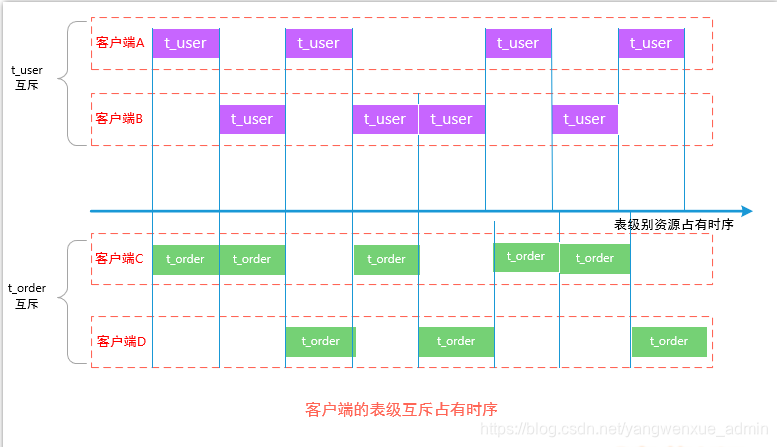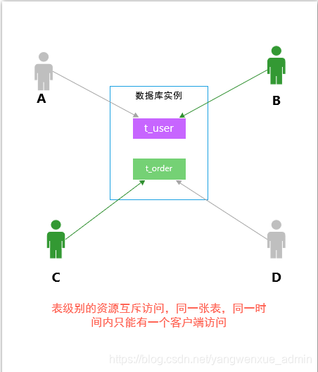 从互斥资源的角度上来讲,客户端访问互斥资源的情况,分别有两对互斥:A <–t_user–> B 、C<–t_order–>D,在做事务隔离控制时,没有必要使用数据库作为互斥资源;可以将互斥资源进行细分,细分到表这一层级。