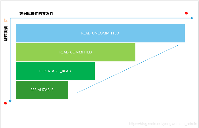 数据库之所以有四种隔离级别,是基于对应的并发能力相关,如下图所示,隔离级别越高,数据库的并发处理能力就越低;反之,隔离级别越低,数据库的并发处理能力就越高。