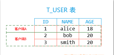 假设现在有客户端A和客户端B,在事务操作时,共同使用一张表T_USER,但是他们操作的行信息有所不同:
