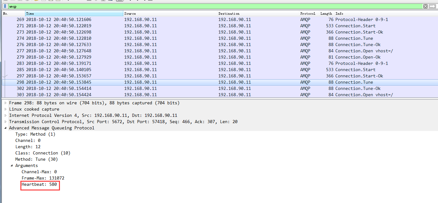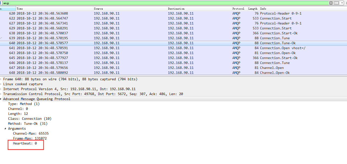 当这个参数设置为0的时候则表示不发送心跳,服务端永远不会断开这个连接,所以这里我为了方便我给发布消息的线程的心跳设置为0,并且我这里,我整理通过抓包,看一下服务端和客户端的协商过程