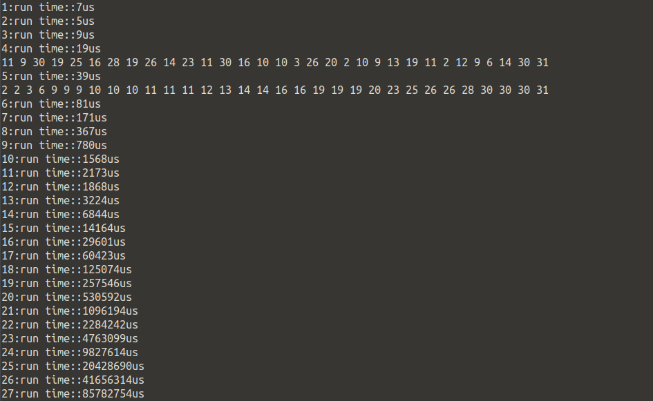 代码中增加了计算时间复杂度的过程,统计了20组不同数据量的排序时间,数据量已2指数增长,为了产生数组,这里增加了一个随机数生成的过程,具体说明已在代码注释中,同时输出了第5组数据未排序和已排序的值,验证一下确实已排序。