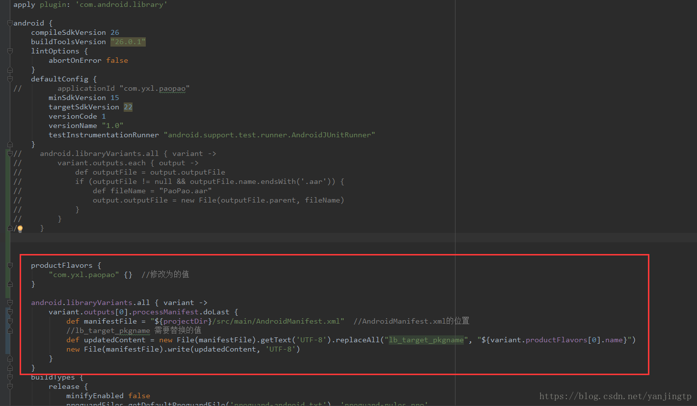 def updatedContent = new File(manifestFile).getText('UTF-8').replaceAll("lb_target_pkgname", "${variant.productFlavors[0].name}")