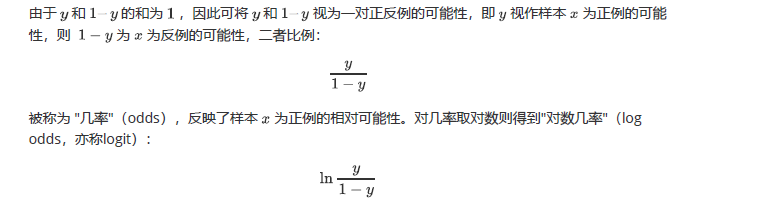 ~~~ 由此看出,上式实际上是在用线性回归模型的预测结果取逼近真实标记的对数几率。