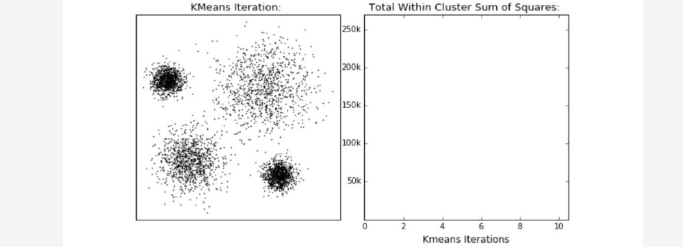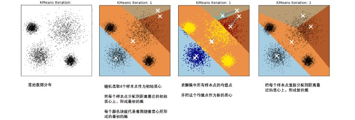 ~~~ 这个过程在可以由下图来显示,我们规定,将数据分为4簇(K=4),其中白色X代表质心的位置: