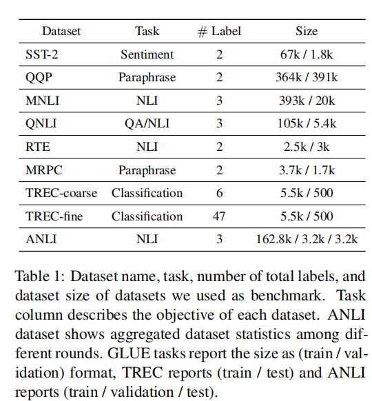 论文实验数据集有文本分类和句子对分类任务: