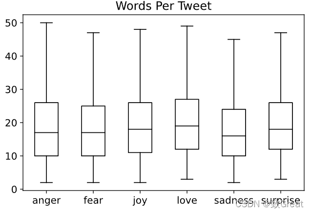 与大多数仅涉及“正面”和“负面”极性的情绪分析数据集不同,该数据集包含六种基本情绪:愤怒、厌恶、恐惧、喜悦、悲伤和惊讶(anger, disgust, fear, joy, sadness, and surprise)。 给定一条推文,我们的任务将是训练一个可以将其分类为其中一种情绪的模型。