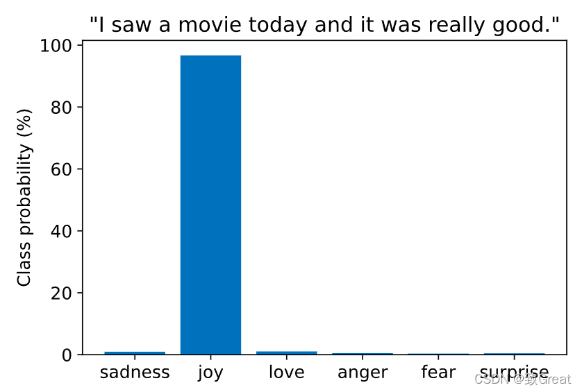 最后,我们可以在条形图中绘制每个类别的概率。 显然,该模型估计最有可能的类别是“快乐”,考虑到推文,这似乎是合理的: