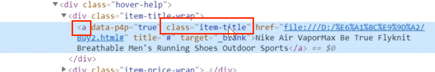 第二步:网页会自动定位到商品标题内容部分。可以显示为a标签,class为item-title,将其填入到python代码中即可。