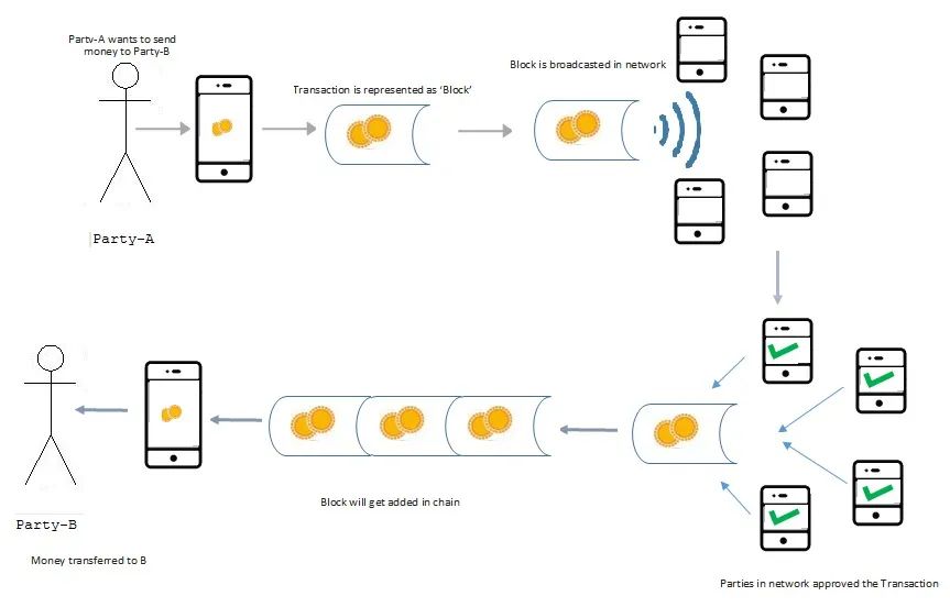 假设甲方想给乙方汇款;因此交易将在线表示为“块”。现在该块将被广播给网络中的每一方。如果交易有效,网络中的所有各方都将批准交易(一个块只有在它遵守所有协议规则时才有效)。如果无效,则不会转发。然后可以将块添加到链中,从而提供持久且透明的交易记录。现在钱转到了乙方。