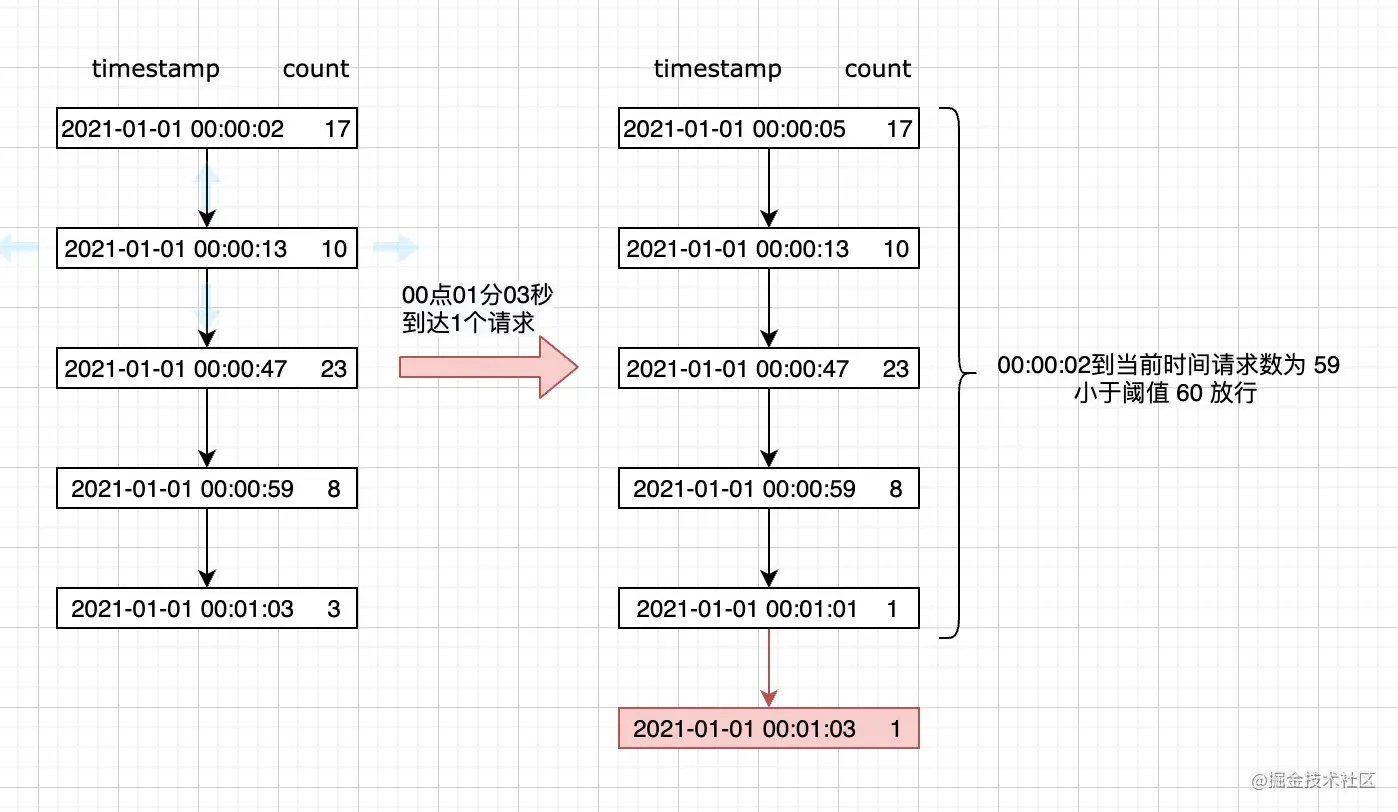 - 判断窗口内的请求数是否超过了限制, 超过则拒绝服务, 否则请求通过