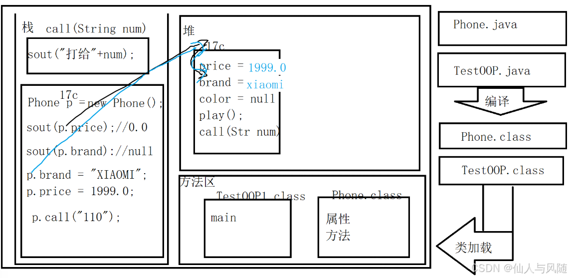 - 堆中创建对象时,开辟空间——》分配地址——》属性和方法初始化给默认值(例如int类型默认为0,String引用类型默认为null)