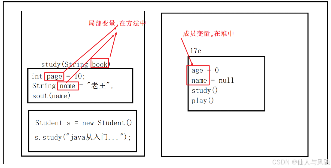 1、成员变量是在类当中,在方法外的变量。作用于类中所有方法,存在堆里。