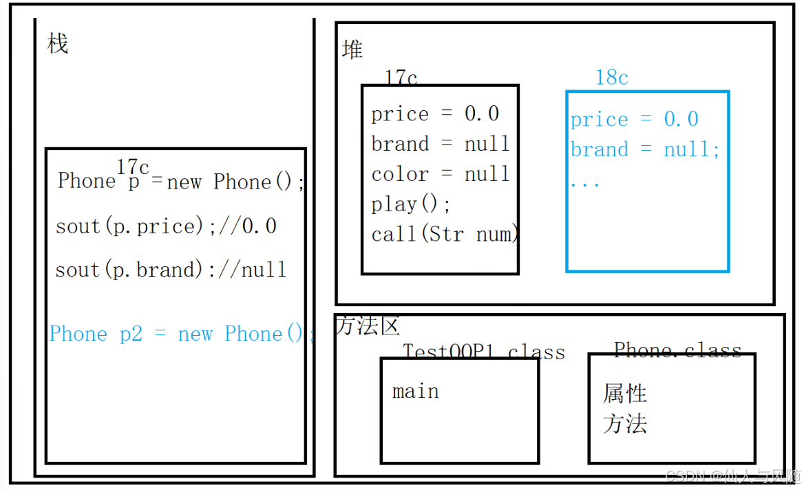 public class Test{ public static void main(String[] args) { /*** * - 一个类可以创建多个对象 * - 对象和对象之间没有关系 * - 每个对象都拥有属于自己的属性和方法 */ // // 创建第1个对象 Phone p1 = new Phone(); p1.brand = "OPPO"; p1.price = 2999.0; System.out.println(p1.price );// 2999.0 System.out.println(p1.brand );// OPPO System.out.println("------------" ); // 创建第2个对象 Phone p2 = new Phone( ); System.out.println(p2.brand );// null System.out.println(p2.price );// 0.0 // p1和p2对象没有任何关系 // p1和p2对象都有属于自己的属性和方法 } } |
