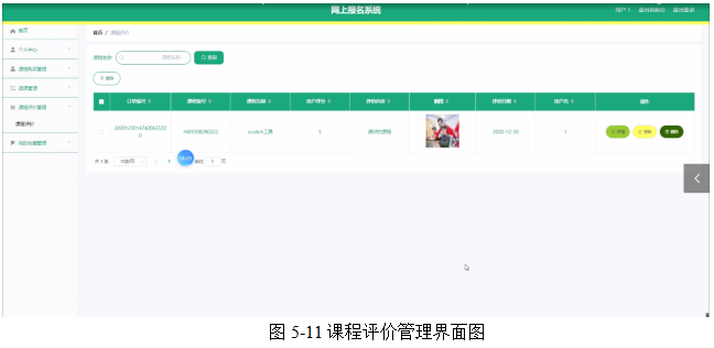 课程评价管理,在课程评价管理列表可以查看订单编号、课程名称、用户评分、评价内容、晒图、评价日期、用户名等内容,并且根据需要进行查看、删除等操作,如图5-11所示。