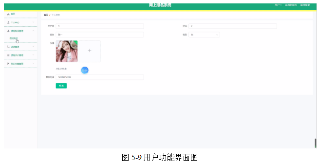 用户登录进入少儿编程网上报名系统可以查看首页、个人中心、课程购买管理、退课管理、课程评价管理、我的收藏管理等内容,如图5-9所示。