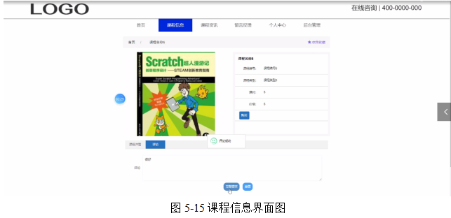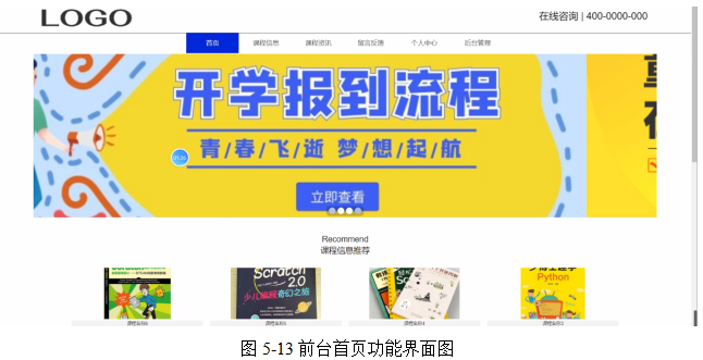 少儿编程网上报名系统在前台首页可以查看首页、课程信息、课程资讯、留言反馈、个人中心、后台管理等内容,如图5-13所示。