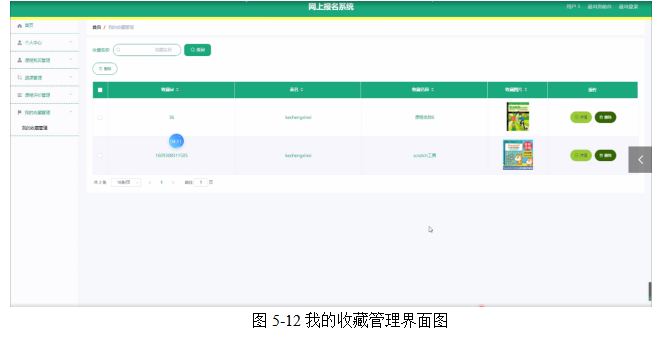 我的收藏管理,在我的收藏管理列表可以查看收藏ID、表名、收藏名称、收藏图片等内容,并且根据需要进行查看、删除等操作,如图5-12所示。