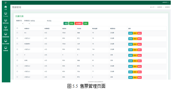 管理员进入指定功能操作区之后可以管理售票。其页面见下图。管理员本人也能增删改查售票信息,还可以统计各种车辆的售票信息。
