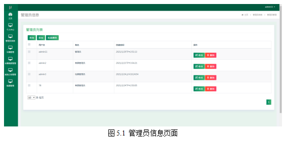 管理员进入指定功能操作区之后可以管理管理员信息。其页面见下图。这里的管理员包括了售票管理员和检票管理员的信息,管理员主要是增删改查有关管理员的数据信息。