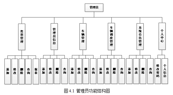 在前面分析的管理员功能的基础上,进行接下来的设计工作,最终展示设计的管理员结构图(见下图)。管理员负责售票管理员和检票管理员的信息管理,对车辆,售票和车辆调度信息执行管理,并统计车辆的售票数据。