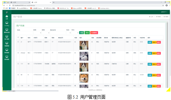 如图5.2显示的就是用户管理页面,此页面提供给管理员的功能有:新增用户,修改用户,删除用户等。
