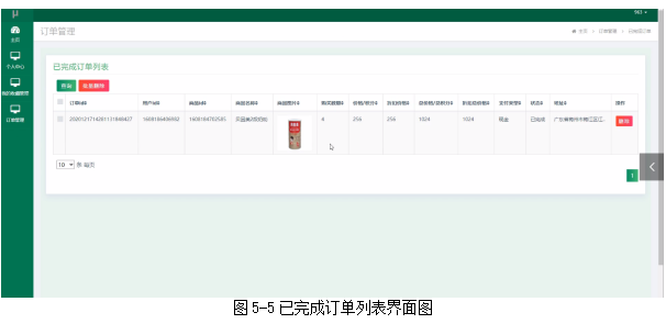 已完成订单列表:通过列表可以获取订单id、用户id、商品id、商品名称、商品图片、购买数量、价格/积分、折扣价格、总价格/总积分、折扣总价格、支付类型、状态、地址等信息,进行查看、删除操作,如图5-5所示。