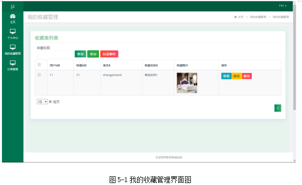 用户点击进入到系统操作界面,可以对主页、个人中心、我的收藏管理、订单管理等功能模块,我的收藏管理:通过列表可以获取用户ID、收藏ID、表名、收藏名称、收藏图片信息并进行修改操作,如图5-1所示。