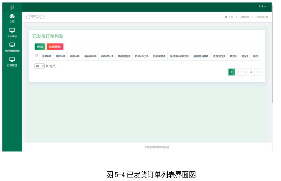 已发货订单列表:通过列表可以获取订单id、用户id、商品id、商品名称、商品图片、购买数量、价格/积分、折扣价格、总价格/总积分、折扣总价格、支付类型、状态、地址等信息,进行查看操作,如图5-4所示。