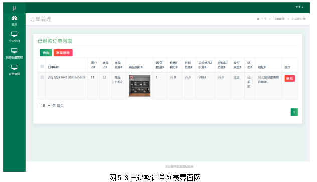 已退款订单列表:通过列表可以获取订单id、用户id、商品id、商品名称、商品图片、购买数量、价格/积分、折扣价格、总价格/总积分、折扣总价格、支付类型、状态、地址等信息,进行查看、删除操作,如图5-3所示。