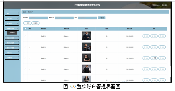 置换账户管理,在置换账户管理页面可以对索引,置换账号,置换姓名,照片,性别,联系电话等内容进行详情,修改和删除等操作,如图5-9所示。