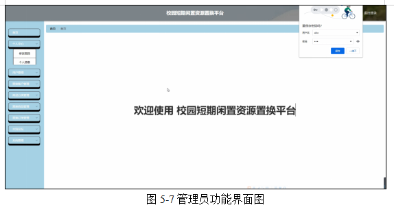 管理员登录系统后,可以对首页,个人中心,用户管理,置换账户管理,商品分类管理,置换商品管理,置换订单管理,交流论坛,系统管理等功能进行相应的操作管理,如图5-7所示。