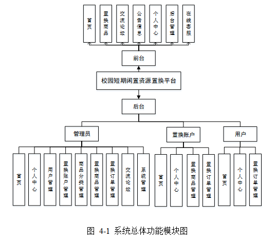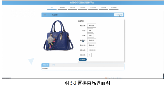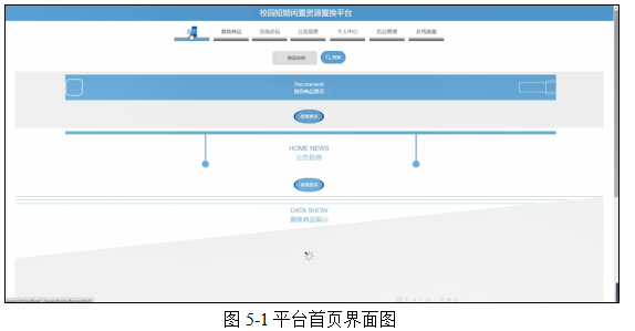校园短期闲置资源转换平台,在平台首页可以查看首页,置换商品,交流论坛,公告信息,个人中心,后台管理,在线客服等内容,并进行详细操作;如图5-1所示。